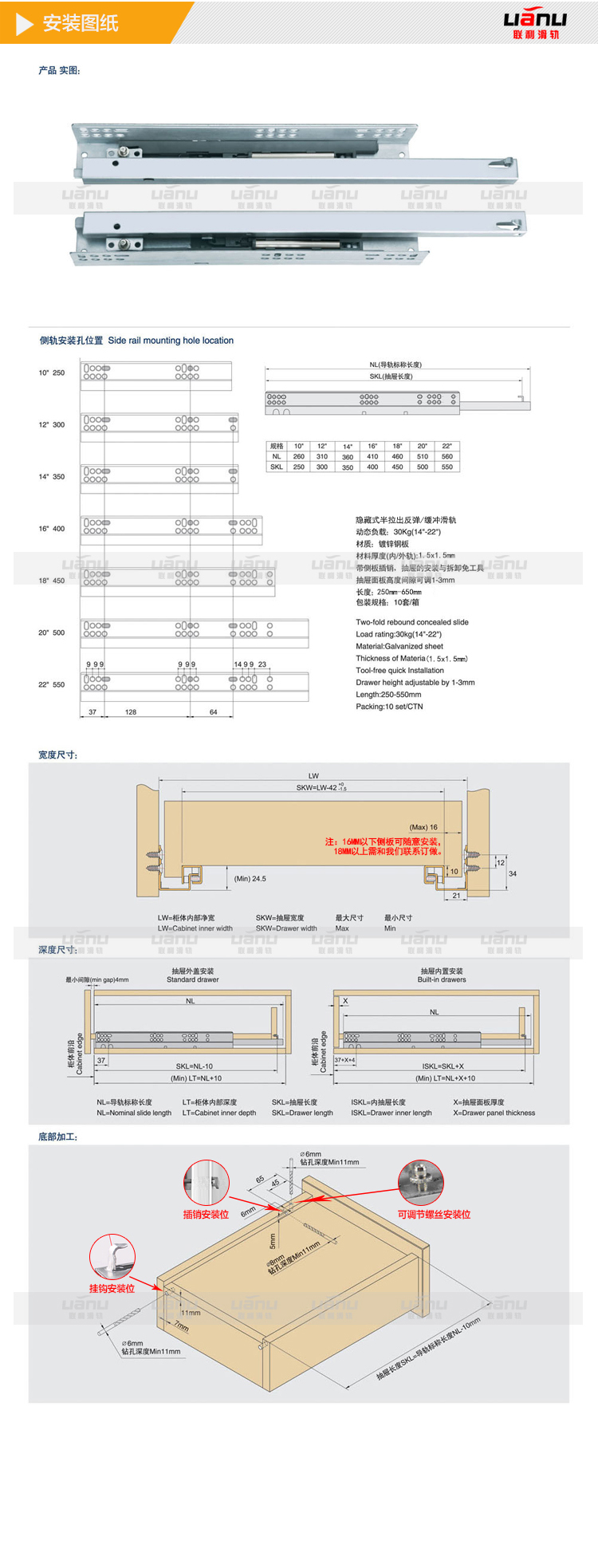 二節(jié)三節(jié)隱藏式緩沖(自吸滑軌,阻尼滑軌)普通三節(jié)緩沖滑軌等的安裝方式大家一定要清楚,并且在安裝的過程中上下對齊,左右對齊等一些基本的問題以外,以下幾個問題一定要特別注意