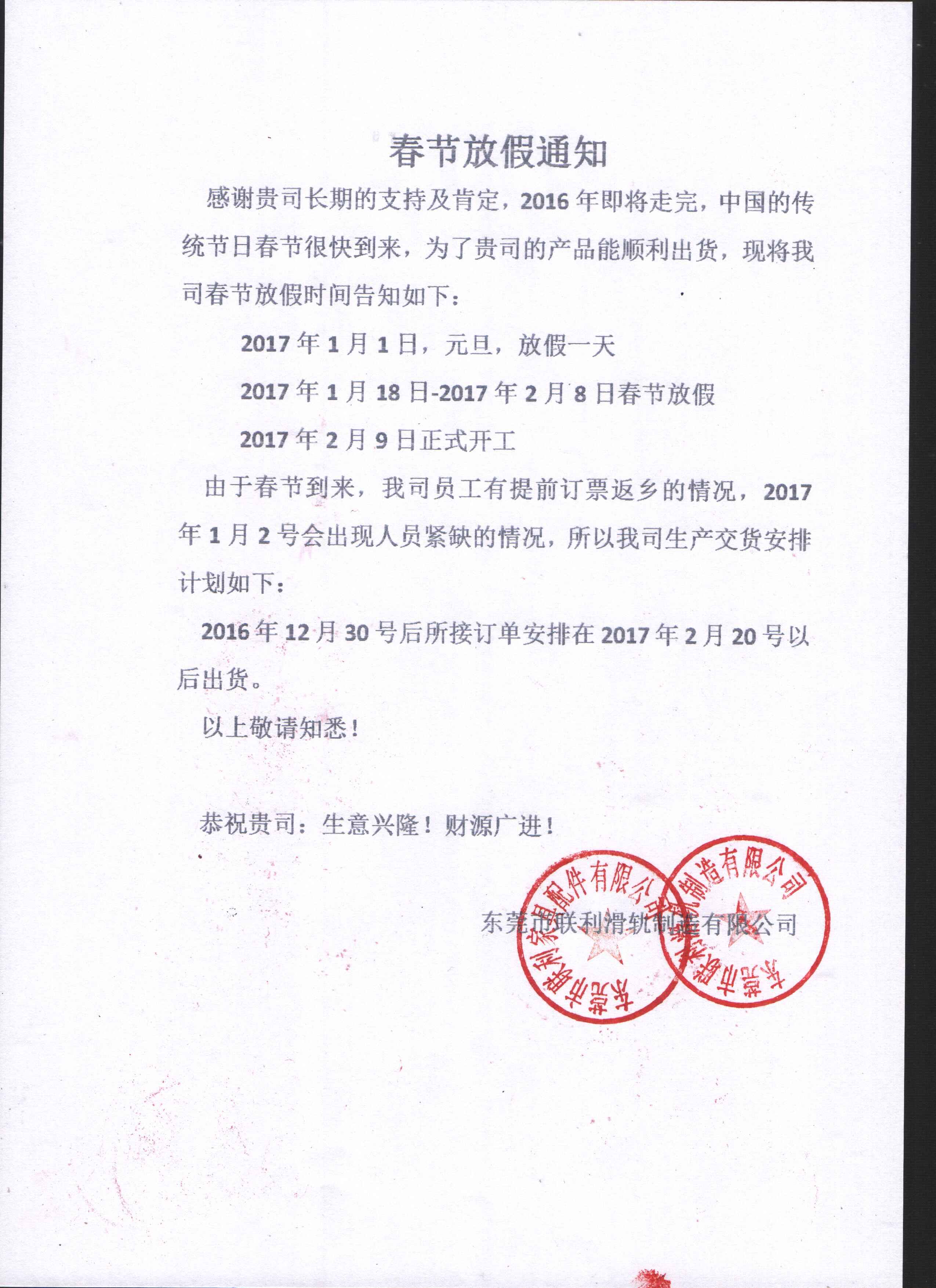 聯(lián)利滑軌2017年春節(jié)放假通知